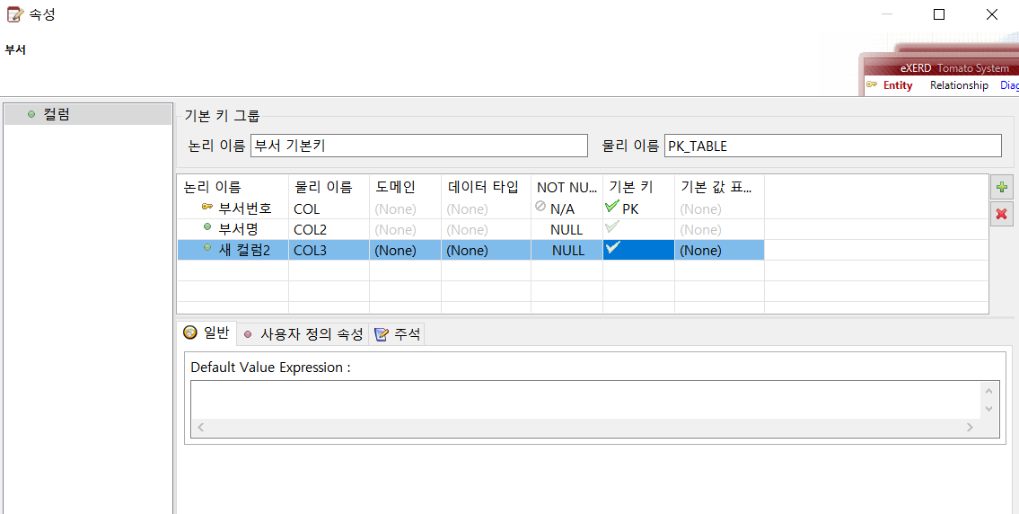 이름, 도메인, 데이터 타입, null, 기본키여부, 기본값 설정
