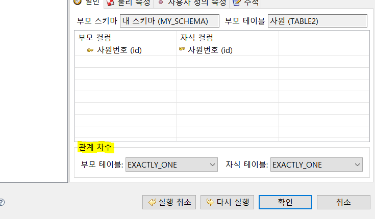 1 대 1: 먼저 일대다 관계를 이어준 후, 그 관계 클릭, 마우스 우클릭, 특성, 관계 차수를 변경해준다