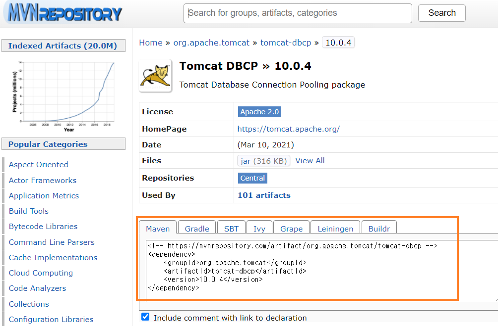 메이븐 레파지토리 사이트를 통해 원하는 아티펙트를 다운받을 수 있다