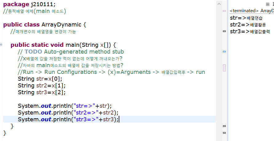 => 메인메소드에서 매개변수명은 변경이 가능하다(args -> x, y, z ...)