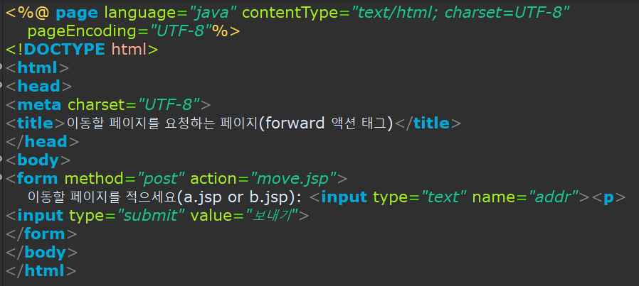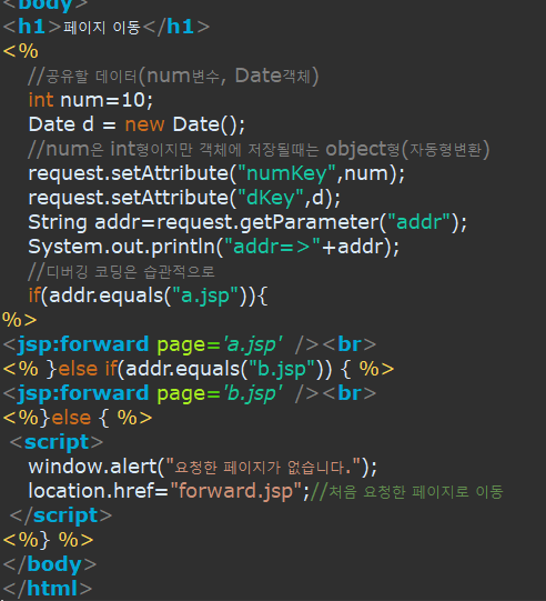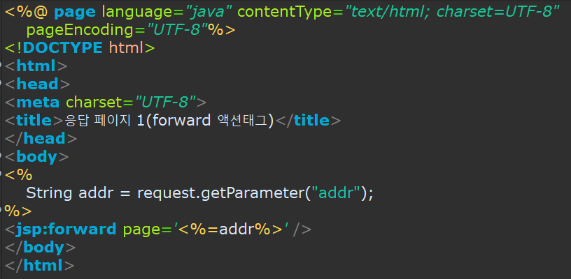 <jsp:forward page='이동할 페이지명(확장자포함)'>