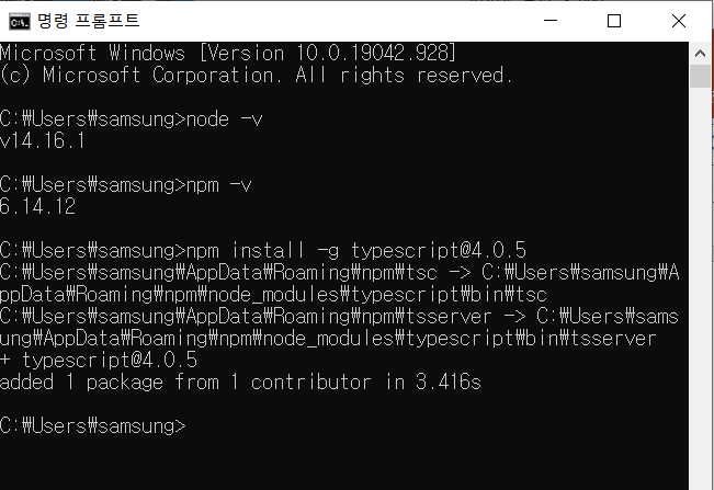 위에서 설치된 Typescript의 설치 경로 확인( 사용자> XXX > AppData > Roaming > npm > node_modules > typescript > bin > tsc